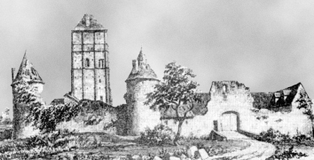 | L’élément archéologique très important est la suite des séries de trous de boulins. En examinant la tour dans son ensemble, on constate que le hourd inférieur restait limité à la face jardin. Tout au contraire, le hourd supérieur parcourt les quatre faces, son plancher se trouvant à la hauteur de 13,40 mètres et le faîte de son toit à près de 19 mètres. Ce hourd constituait ainsi un système défensif permanent auquel l’on accédait par une porte en arc double située sur la face ville, actuellement murée et par une seconde porte encore ouverte sur la face jardin. | ![]() |
